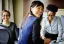 Three women in business attire smile while sitting on a bed.